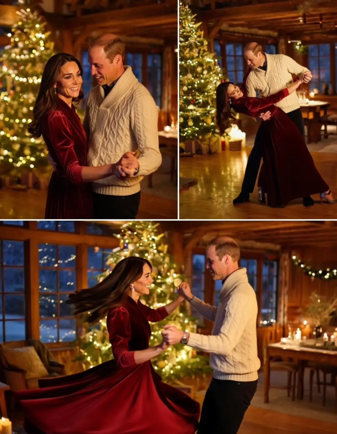 Under the soft glow of Christmas lights inside the Royal Forest Lodge, William gently took Catherine’s hand — and the two slipped into a quiet, intimate dance that no one expected. No royal gowns, no formal choreography, no cameras flashing… just a husband and wife moving together by the fireplace, laughing softly as George, Charlotte, and Louis peeked from behind the tree.